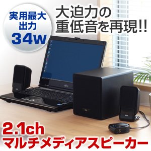小型で省スペースに設置できるサテライトスピーカーと、迫力ある重低音を出力するサブウーハーで構成された2.1chマルチメディアスピーカー。大口径4インチのサブウーハーを搭載しており、迫力の重低音を再現。小型ながら3つのスピーカーを合わせて実用最大出力34Wの大出力となる。パソコンだけでなくiPhone・iPodなどのMP3プレーヤーにも接続可能。